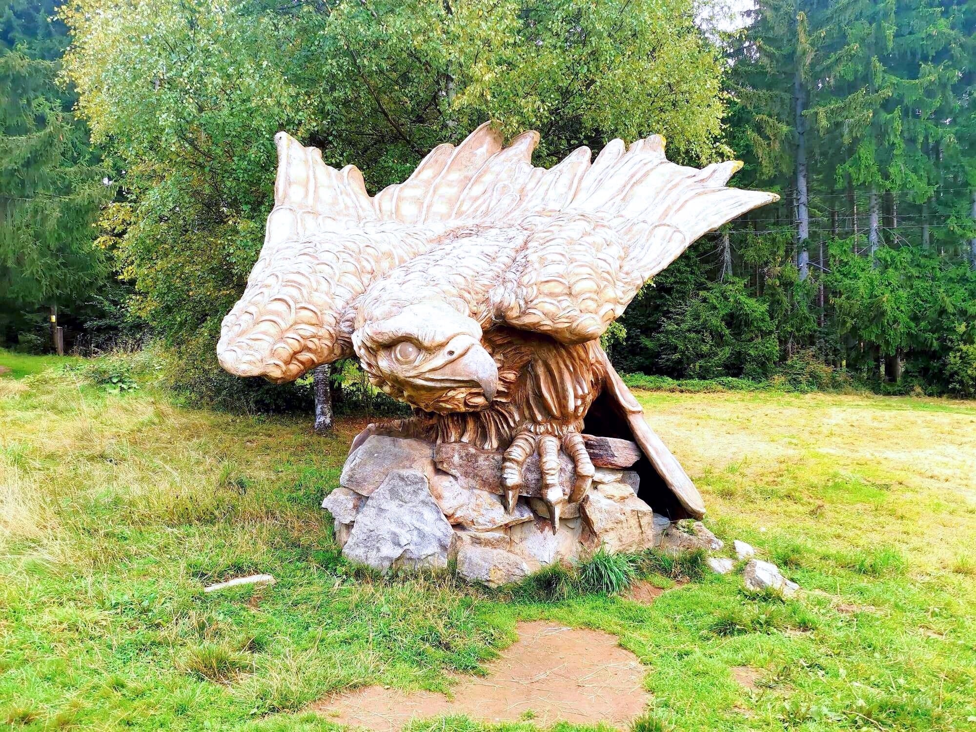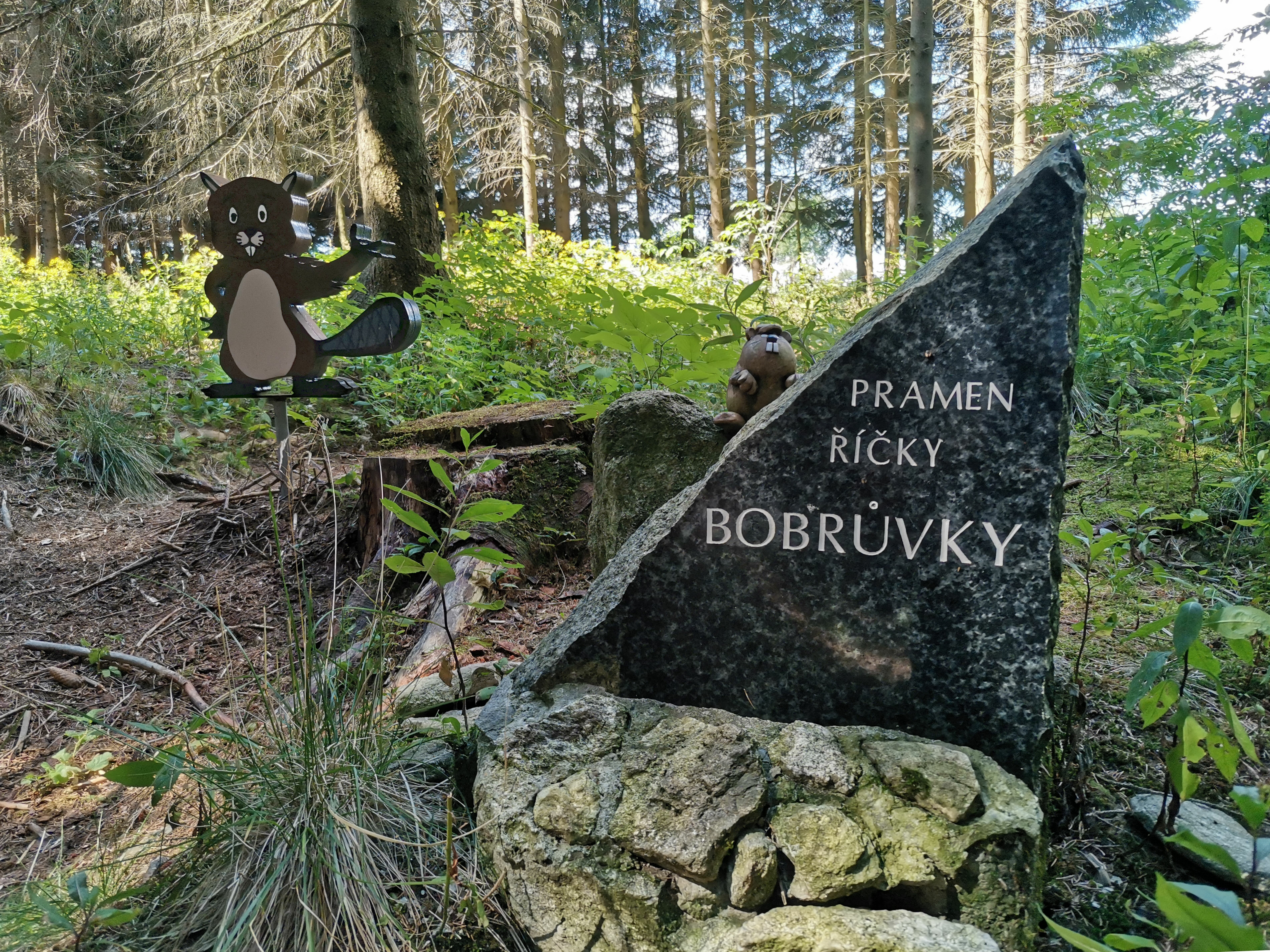 Odsud se vrátíte zpátky na modrou turistickou značku a kolem sochy Káněte od Michala Olšiaka vyrazíte objevit pramen řeky Bobrůvky, který stylově střeží dřevěný bobr.
