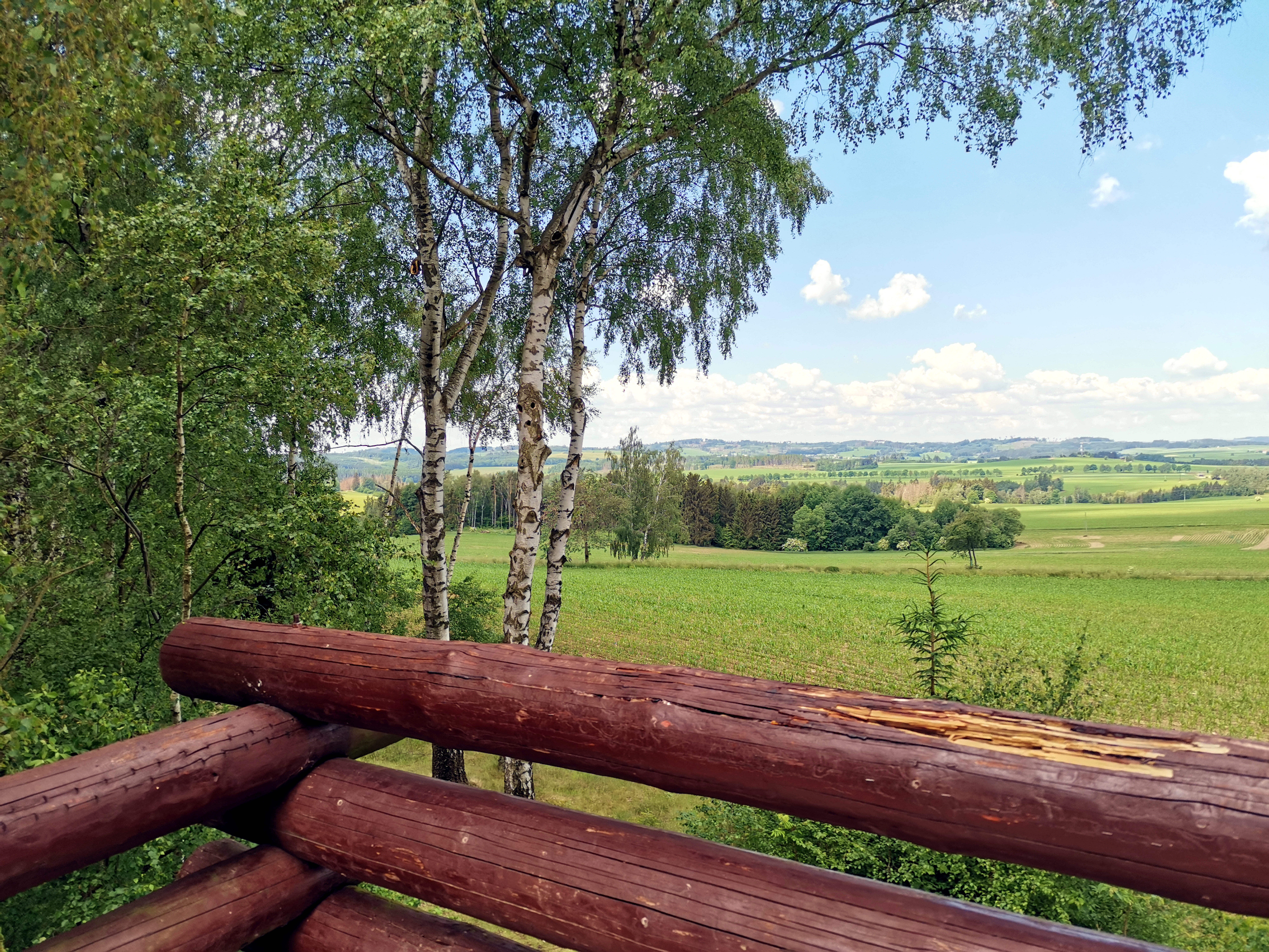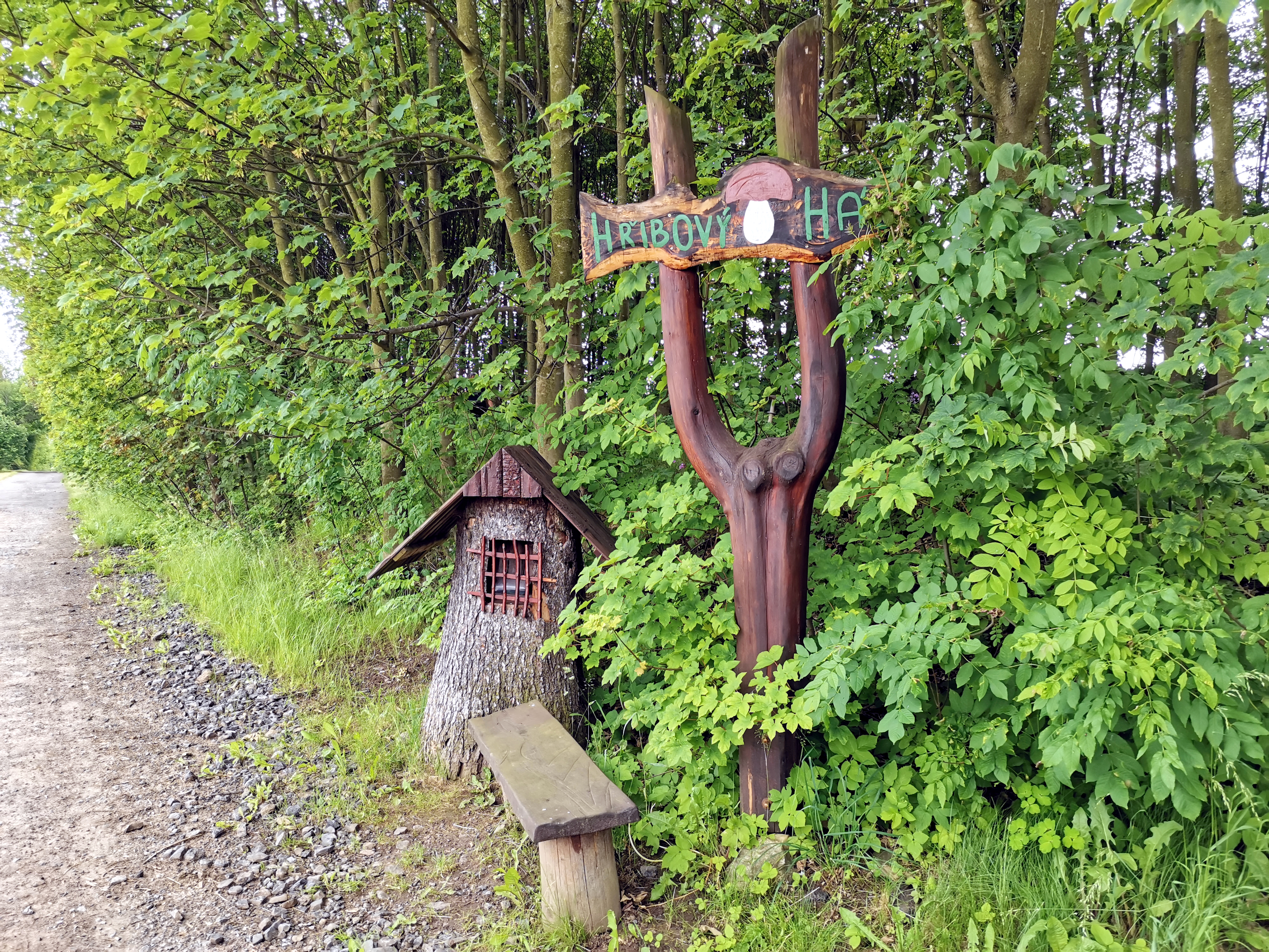 Trasa začíná na návsi, kde uvidíte mnoho dřevěných sošek hub (ty vás budou provázet po celý den). Jako první zamiřte k vyhlídce Na Kříbu. Vyhlídková plošina se nachází na střeše bývalého vodojemu a nabízí úchvatný výhled na Kněževes a přírodní park Bohdalovsko.