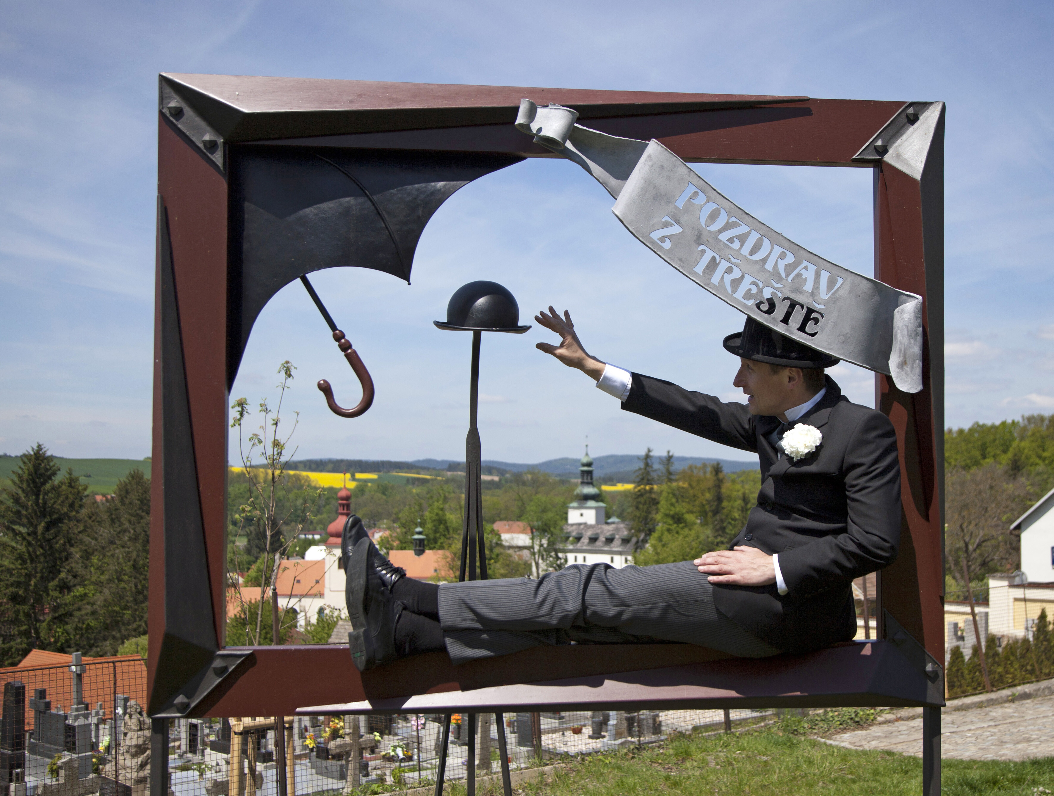 Jednou z místních atrakcí je také obří kovaná pohlednice, kterou vyrobili v místní Kovárně Na vyhlídce a objevíte ji, pokud vystoupáte po trase Křížové cesty nad město. Pak už jen vyjdete schůdky k pohlednici, vsunete hlavu do buřinky a rázem se stanete součástí Pozdravu z Třeště s levitující buřinkou a deštníkem. Pokud telefon správně natočíte, pozadí pozdravu vám pěkně vytvoří věže zámku a kostela sv. Martina.
